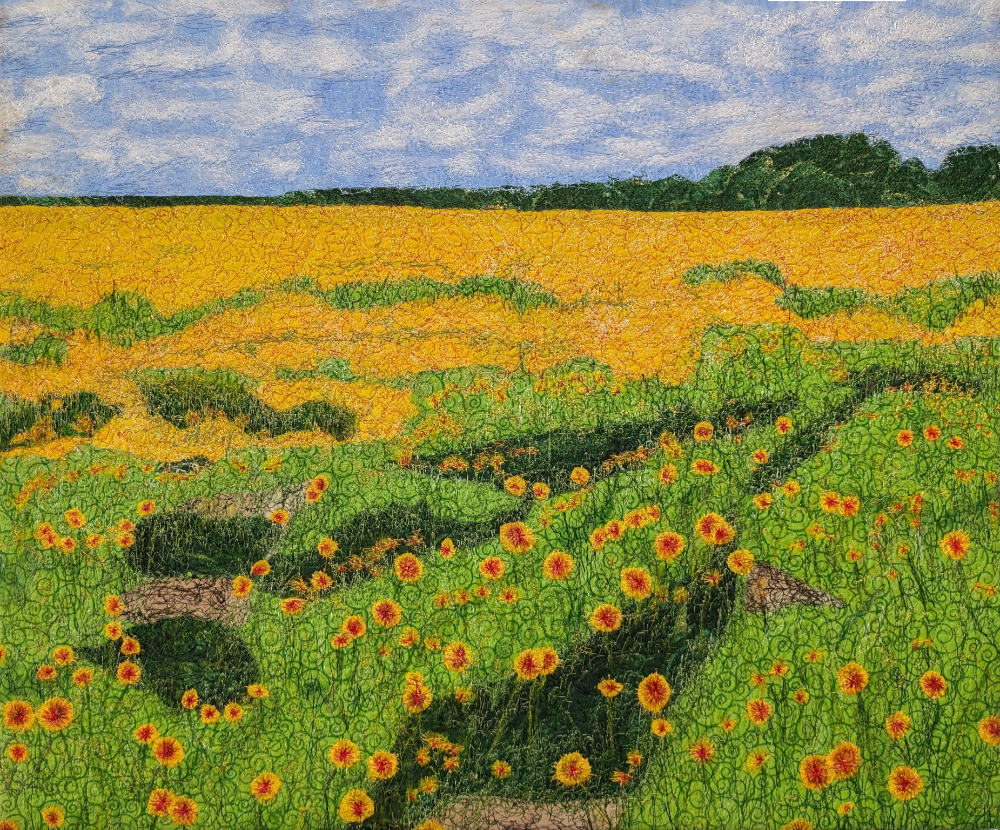 An experiment that partly worked and partly didn’t. Painting with fabric is a whole ‘nother thing. I used medicine bottle cotton for the clouds, partly felted into the fabric and then quilted. I was...